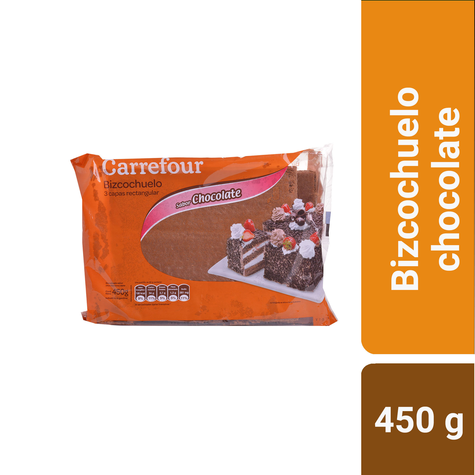 Bizcochuelo Carrefour rectangular 3 capas chocolate 450 g.